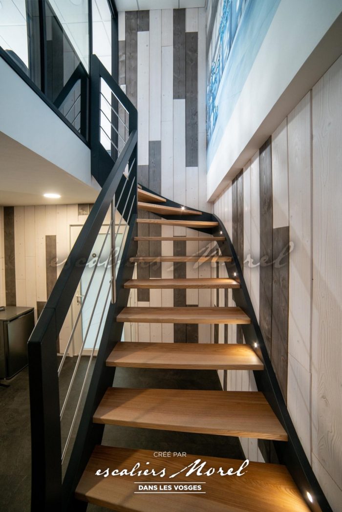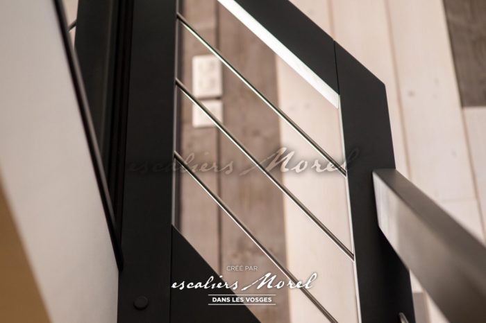 Harmonie entre l'escalier et son ensemble, avec des lignes tendues et épurées. Intégration de spot LED dans le limon.