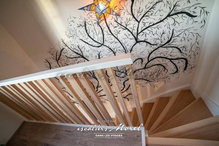 Escalier aux limons bois, laqués blanc lisse. Marches en Frêne Olivier et contremarches laquées blanche également. Petite particularité : un garde-corps original composé de longues balustres à la largeur aléatoire.