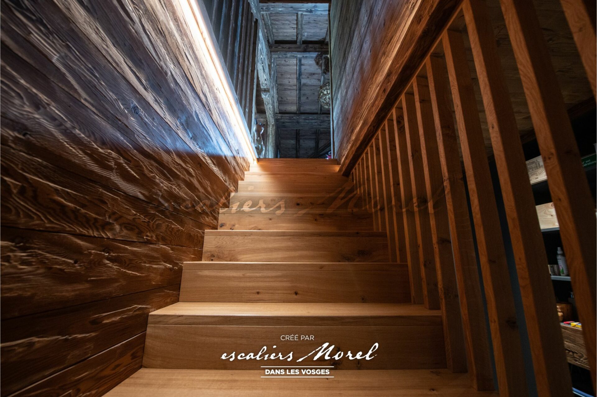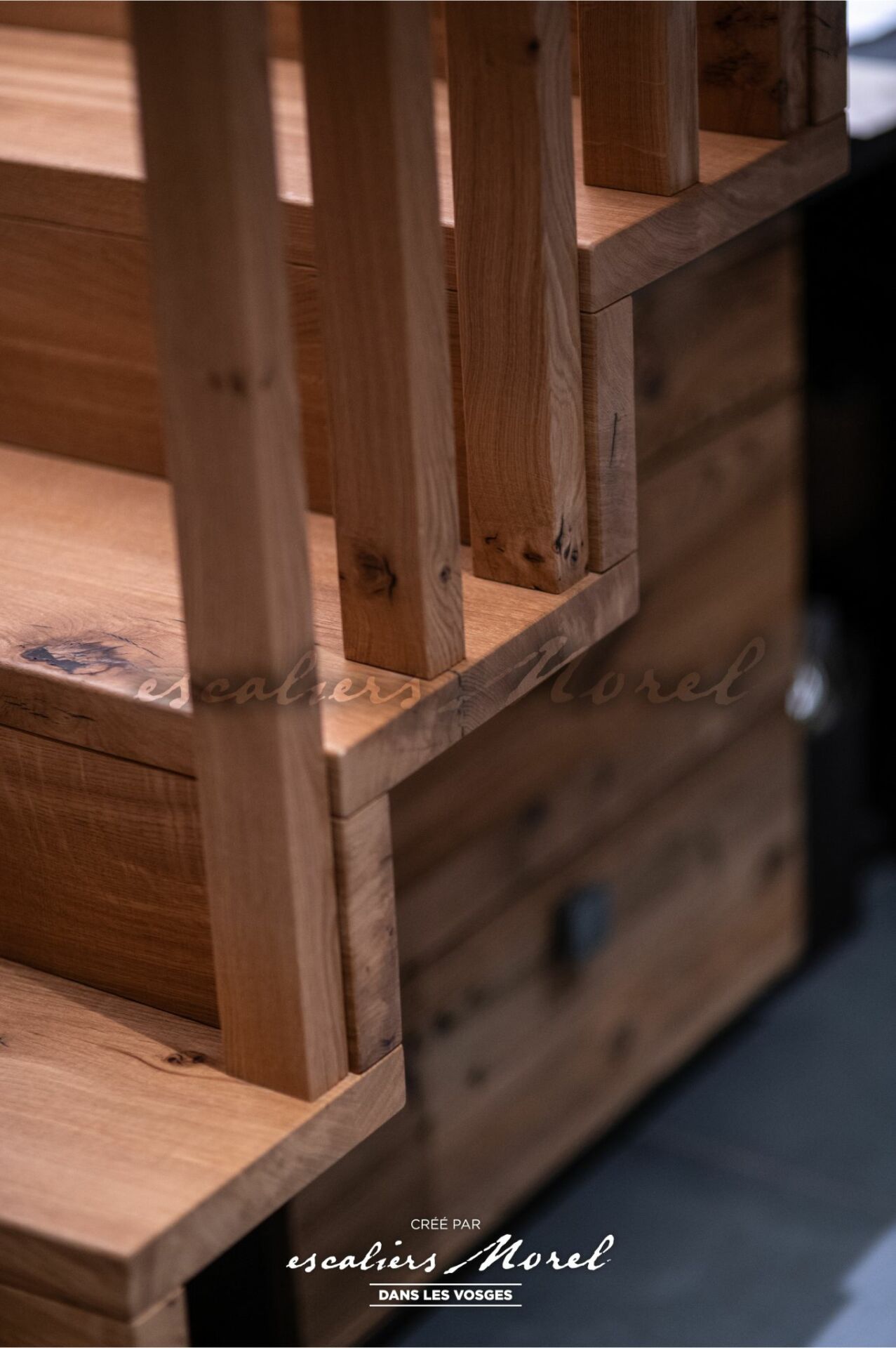 Escalier sobre tout en bois intégré dans un chalet moderne. Marches et contremarches en dents de scie, suspendu par un claustra.